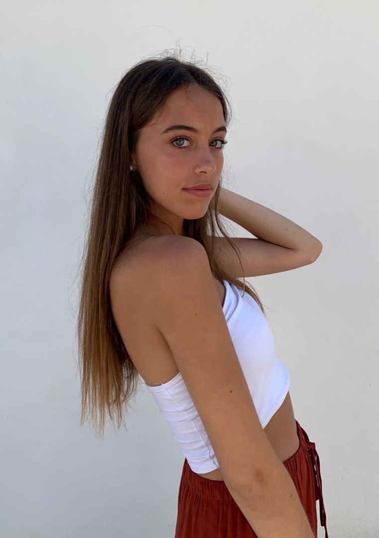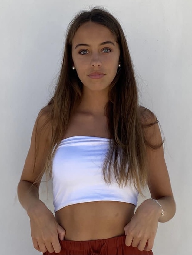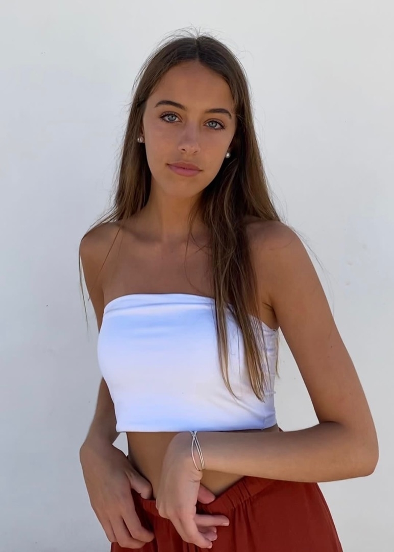 Ojos azules muy llamativos con pestañas negras y largas. Labios voluminosos. Piernas largas.
