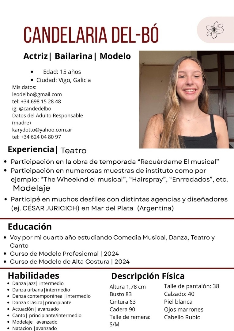 Soy actriz, modelo, bailarina de jazz, urbano, contemporáneo, etc., Artista de Comedia Musical con amplia experiencia y estudios. Ya he actuado en mi país de origen Argentina, en diversas obras de teatro, Comedias Musicales, y así también he desfilado para varias marcas y diseñadores alta costura.