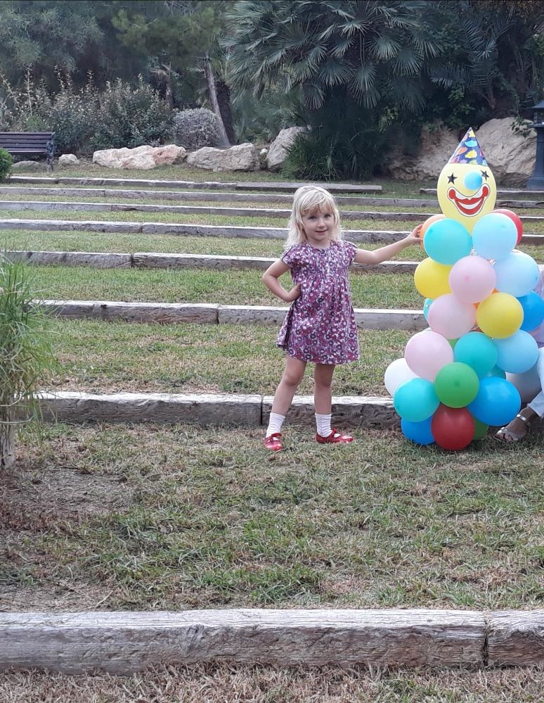La niña con ojo azules claritos pelo rubio liso medio largo la piel blanca muy guapa tiene 4 años padre espanol y rusa hable 2 idiomas muy activa y presumida le encanta posar