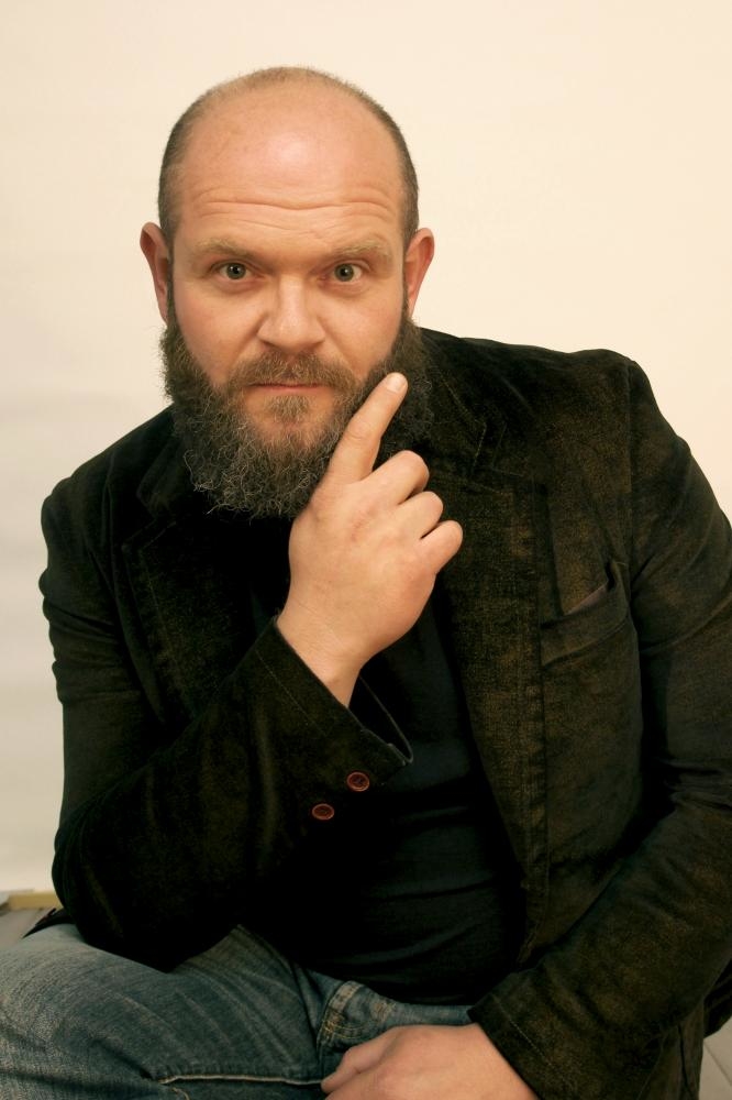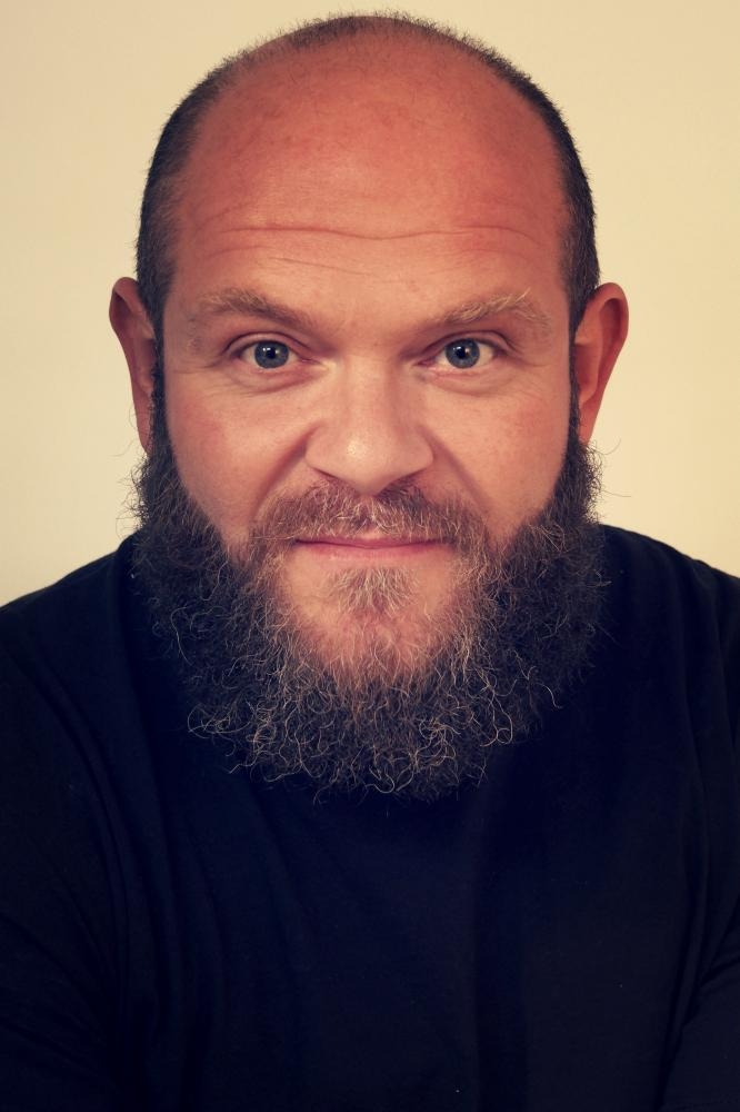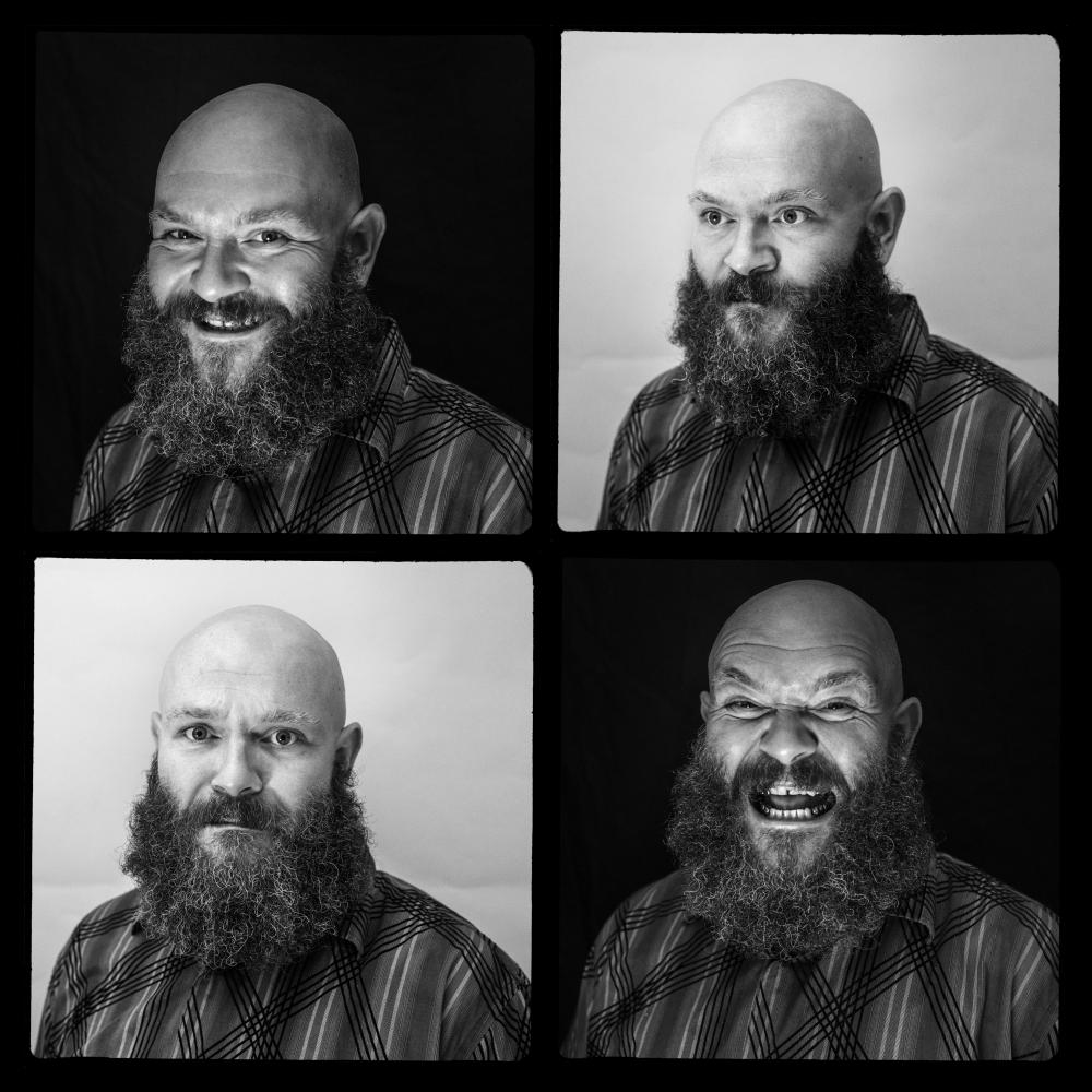 Barba, tatuajes, dientes de acero inoxidable, cicatrices.