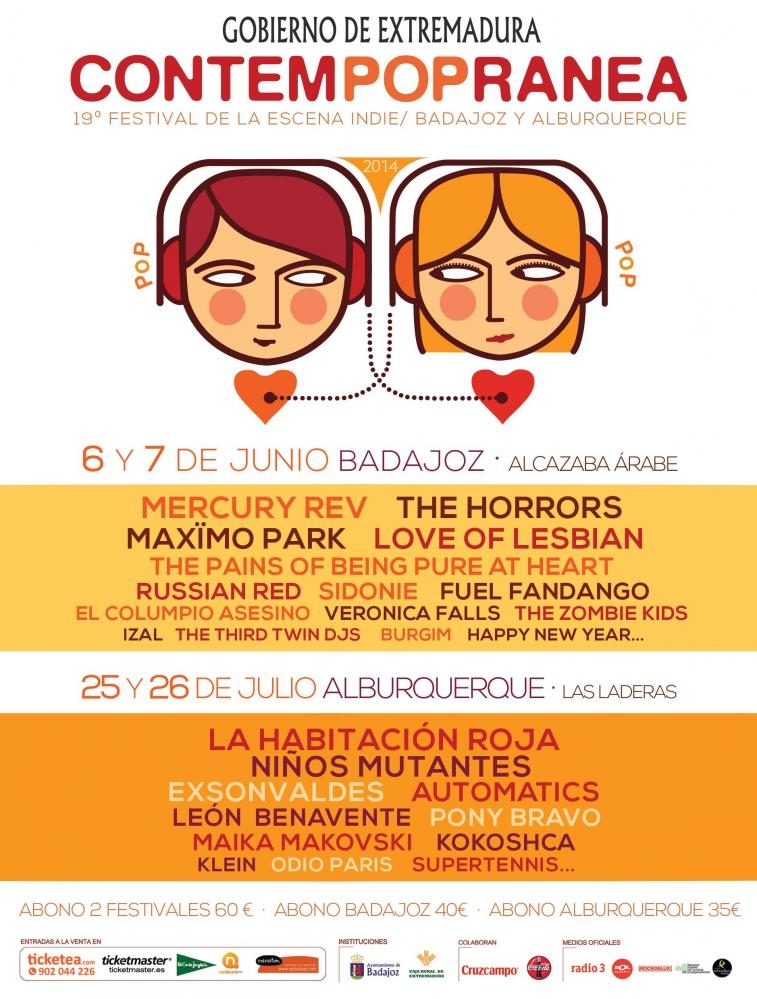 En Contempopránea 2014 actuarán Russian Red, que presentará Agent Cooper, su último LP editado en Febrero del 2014, Niños Mutantes presentarán el LP que justo están terminando de grabar. La Habitación Roja traerán a Alburquerque la presentación de su último disco titulado "La Moneda en el Aire". Exsonvaldes presentarán los temas del álbum Lights. Automatics, grupo mítico de los 90’s, será la banda homenajeada en Alburquerque, y su reunión una de las más esperadas. Pony Bravo, que presentarán los temas de su recién editado trabajo De Palmas y Cacería. Maika Makovski con su potente y natural directo. León Benavente, que presentará el EP Todos contra Todos y el LP Leon Benavente. Klein, Ama, y la banda extremeña, Supertennis .
